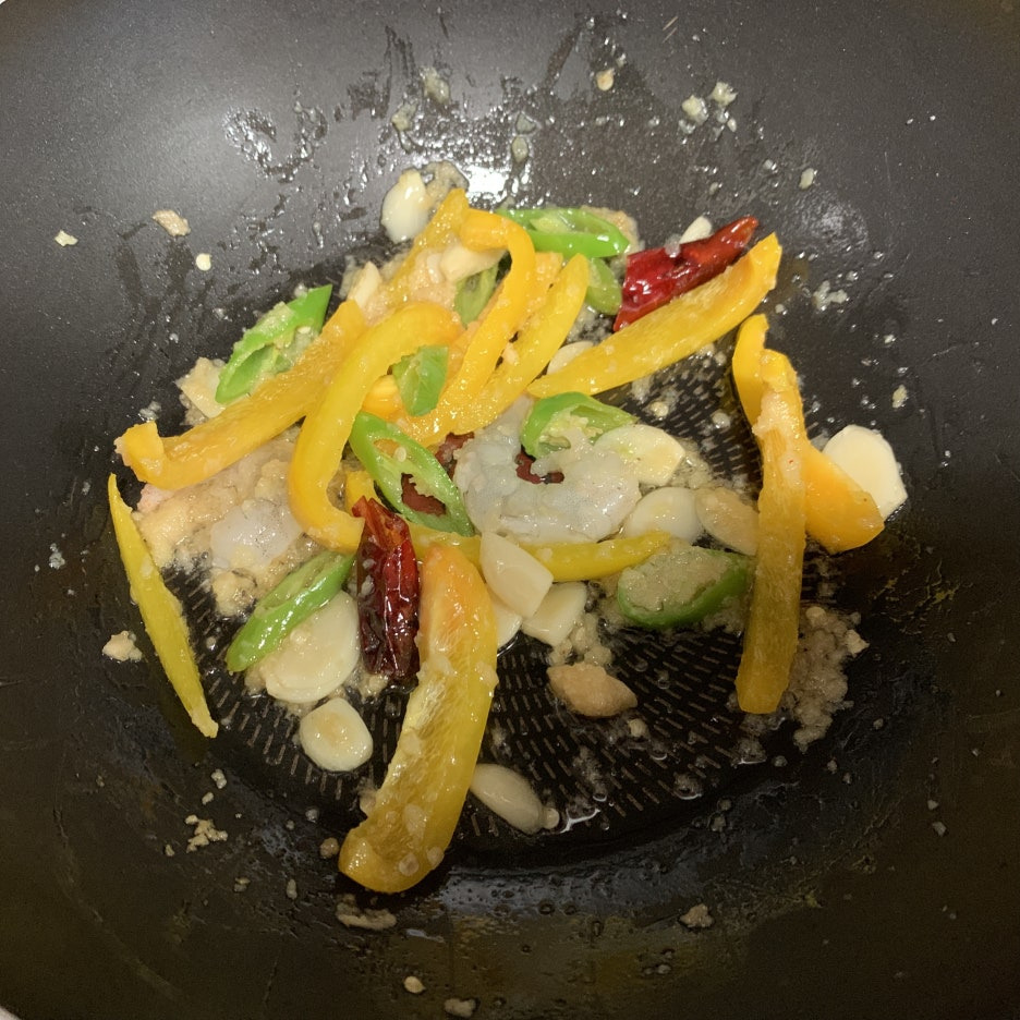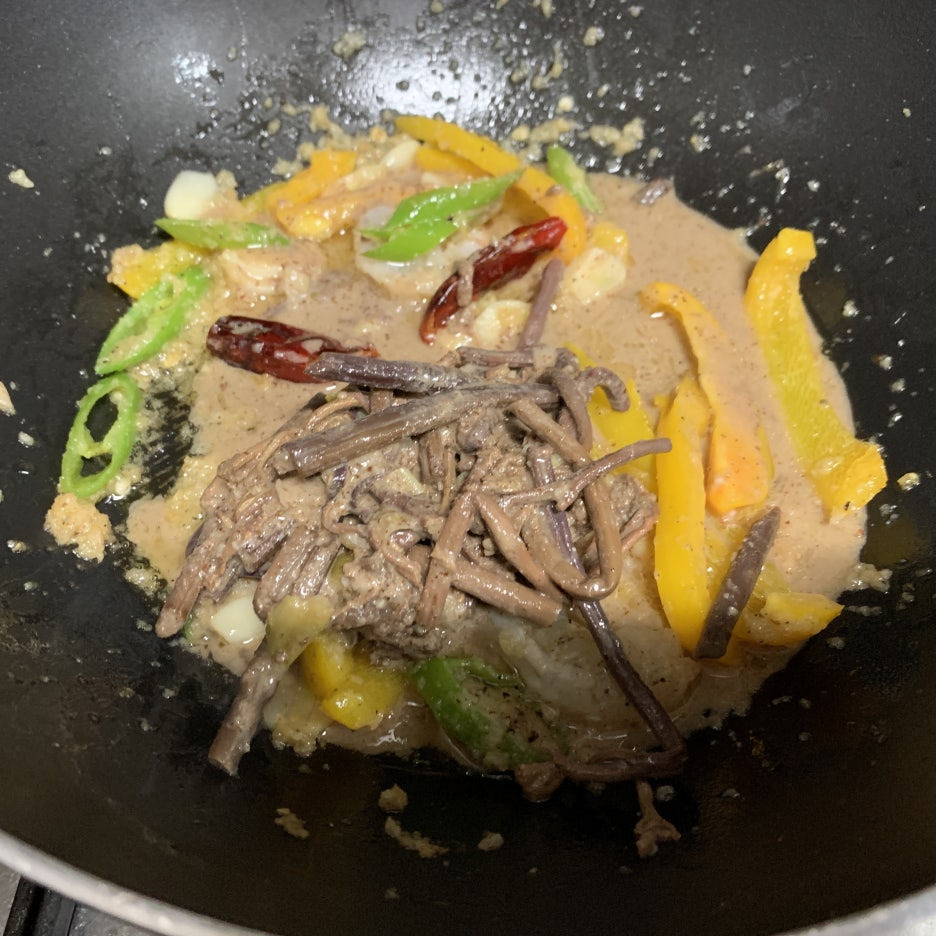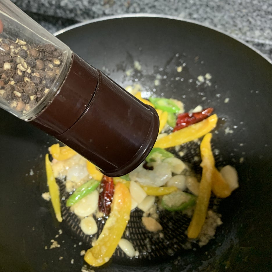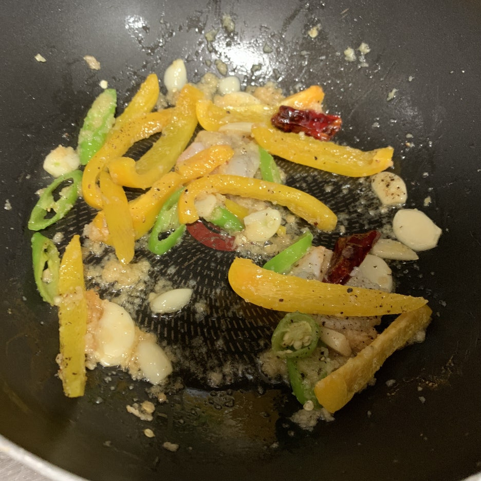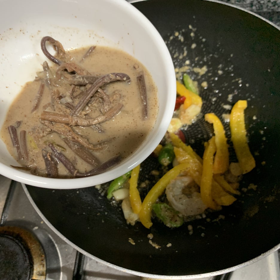 썰어둔 파프리카와 새우를 넣고 후추를 조금 뿌려준 다음 섞어줍니다. 휘적휘적 저어준 뒤, 준비해둔 고사리 나물을 넣어줍니다!