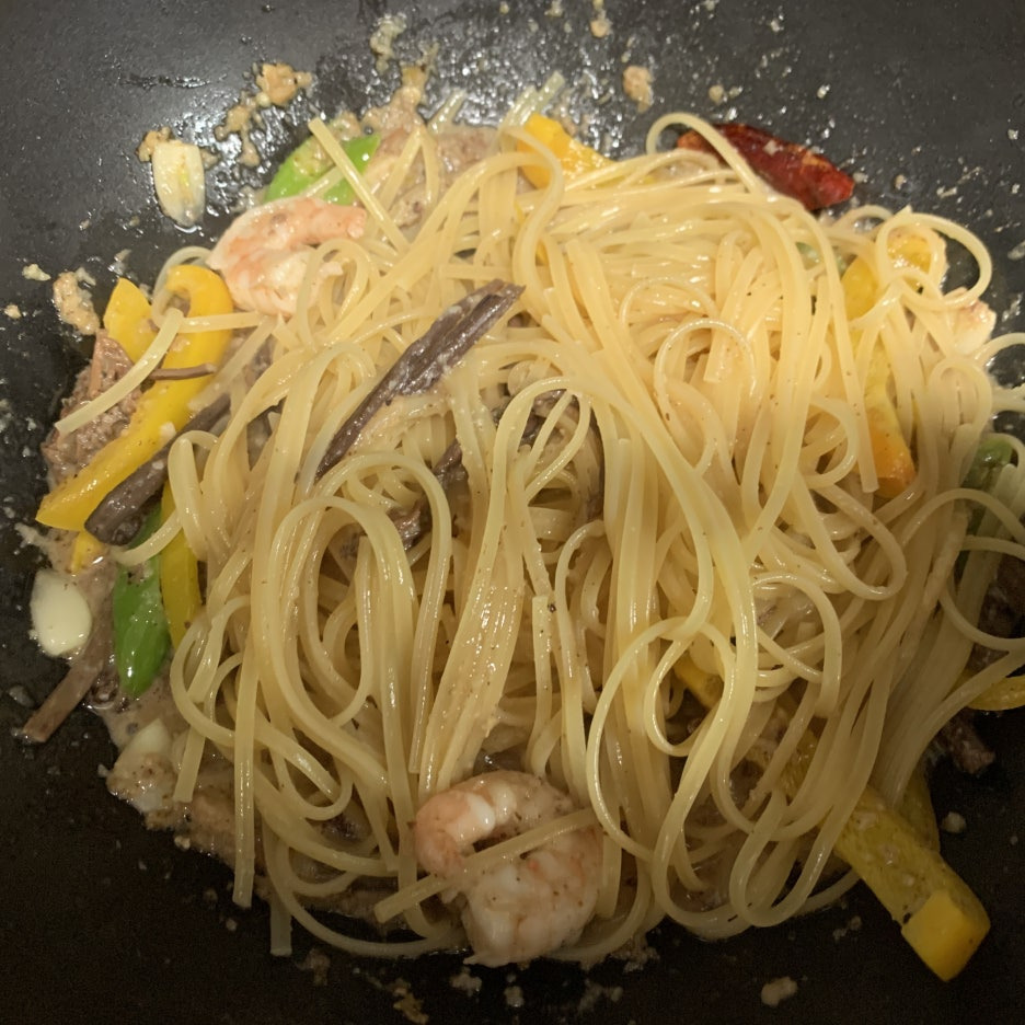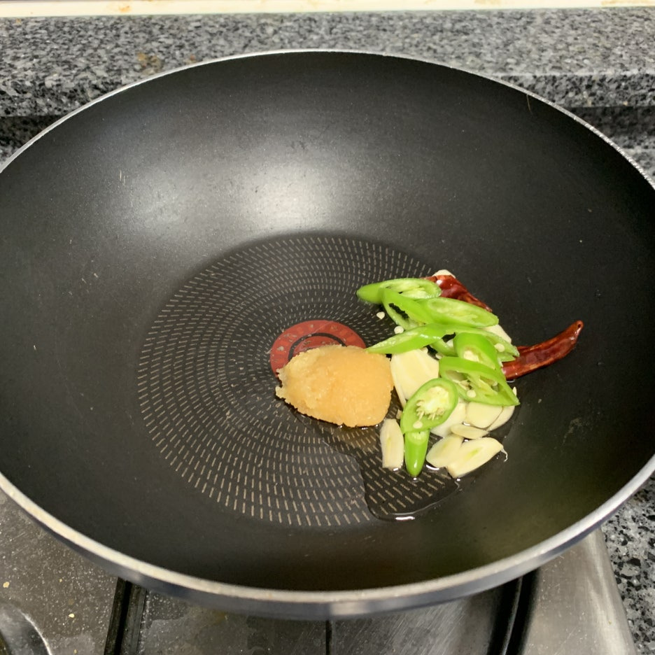 파스타 면을 삶는 동안 고사리 양념을 준비해봅니다! 웍에 기름을 넉넉히 두르고 다진 마늘, 편마늘, 고추를 모두 넣고 불을 약하게 켜줍니다. (약불입니다!) 다진 마늘이 색이 조금 하얗게 변하면서 고소한 마늘 향이 올라오면, 나머지 재료들을 넣어줍니다.