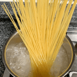 물이 팔팔 끓어오르면, 준비해 둔 파스타 면을 냄비 안으로 집어 넣어줍니다. 이때, 밖에서 노는 파스타면이 없도록 인정사정없이 끓는 물 속으로 넣어줍니다. (가스불 위에서 냄비 밖으로 파스타면이 있을 경우 파스타면이 냄비의 열에 의해서 타버립니다! 저도 몇 번 버린 적이 많아요🥲)