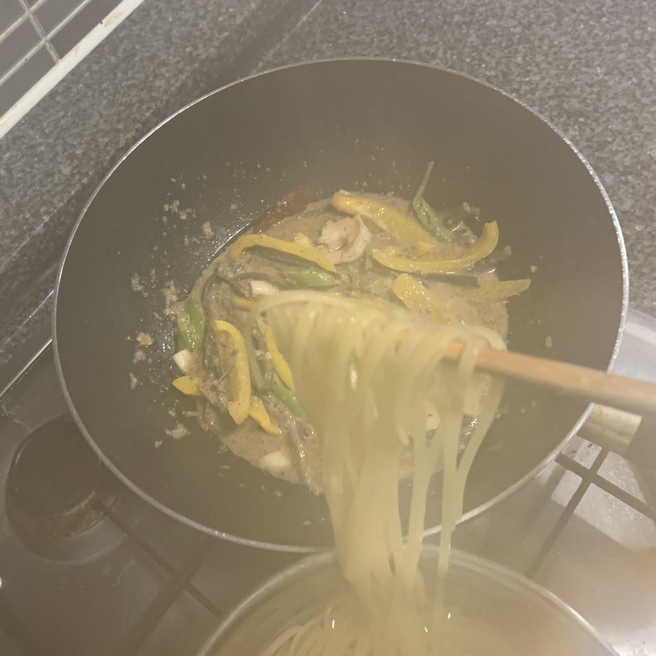 준비된 양념에 취향에 맞게 삶아진 파스타면을 넣어줍니다. 퍼진 면을 좋아하는 저는 삶아진 상태에서 바로 양념에 넣었는데, 만약 꼬들꼬들한 면을 좋아하시는 분들이 계시다면, 면을 미리 건져서 올리브 오일에 버무려 두시면 좋을 것 같아요. 그렇게 하면 잘 안퍼지고 딱딱한 식감을 느낄 수 있습니다!