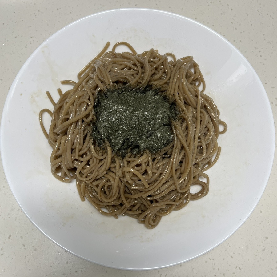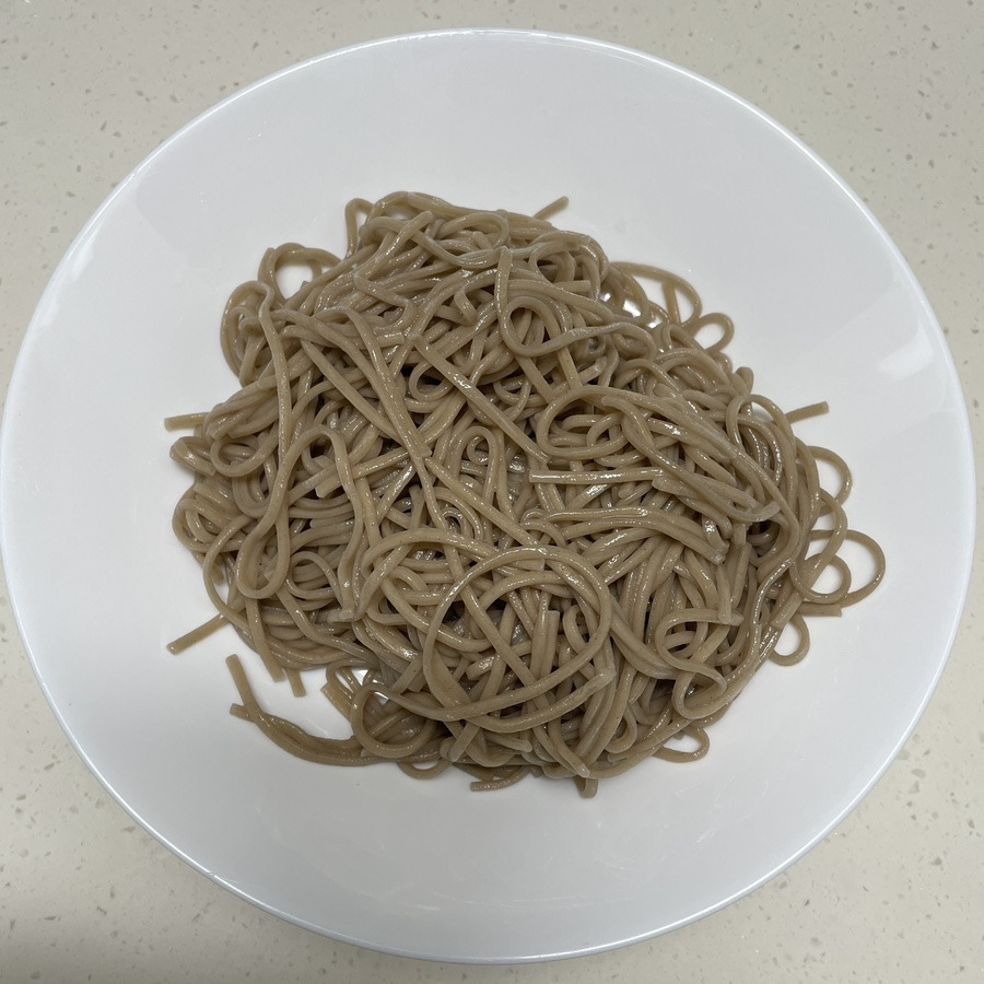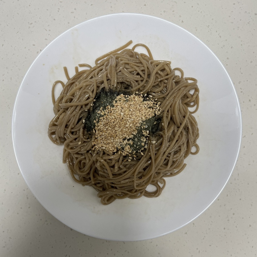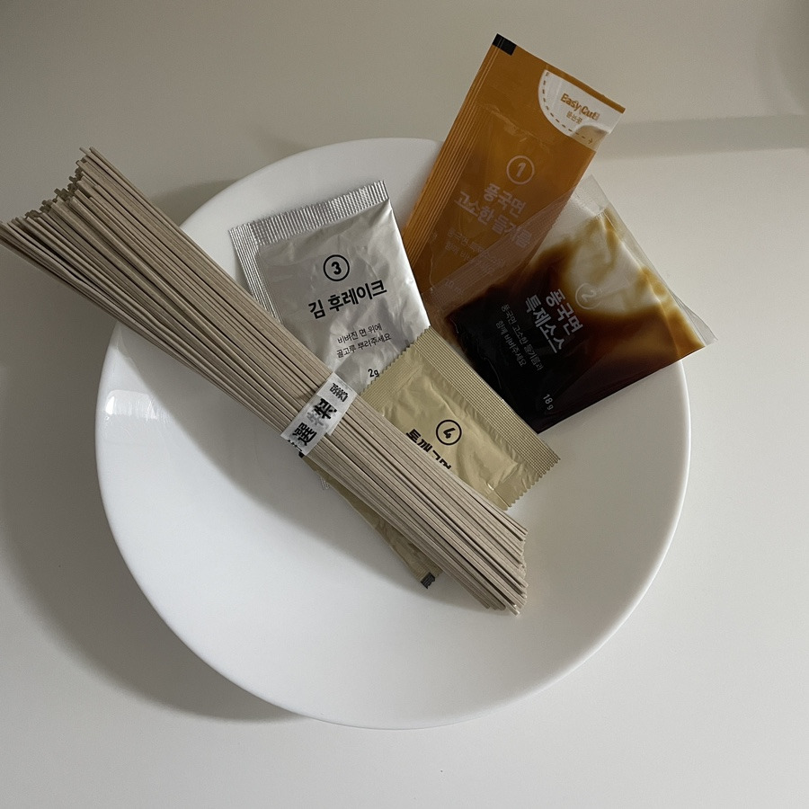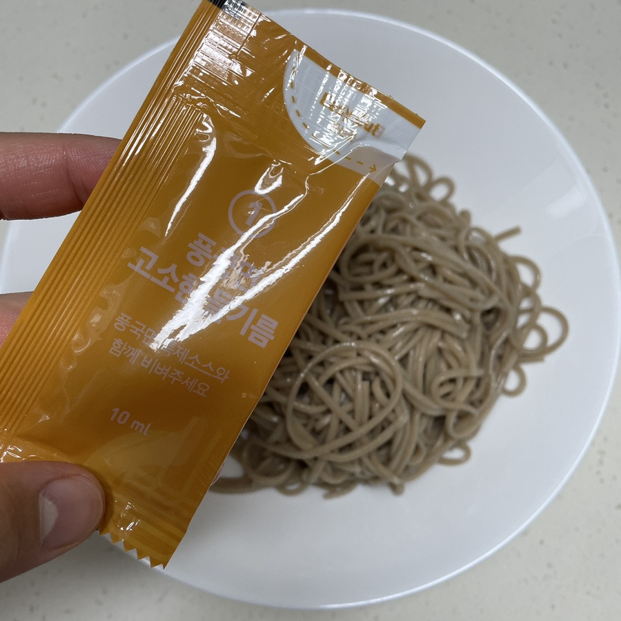 ** 1인분의 메밀면 묶음, 들기름, 간장소스, 통깨 고명, 김 고명 **