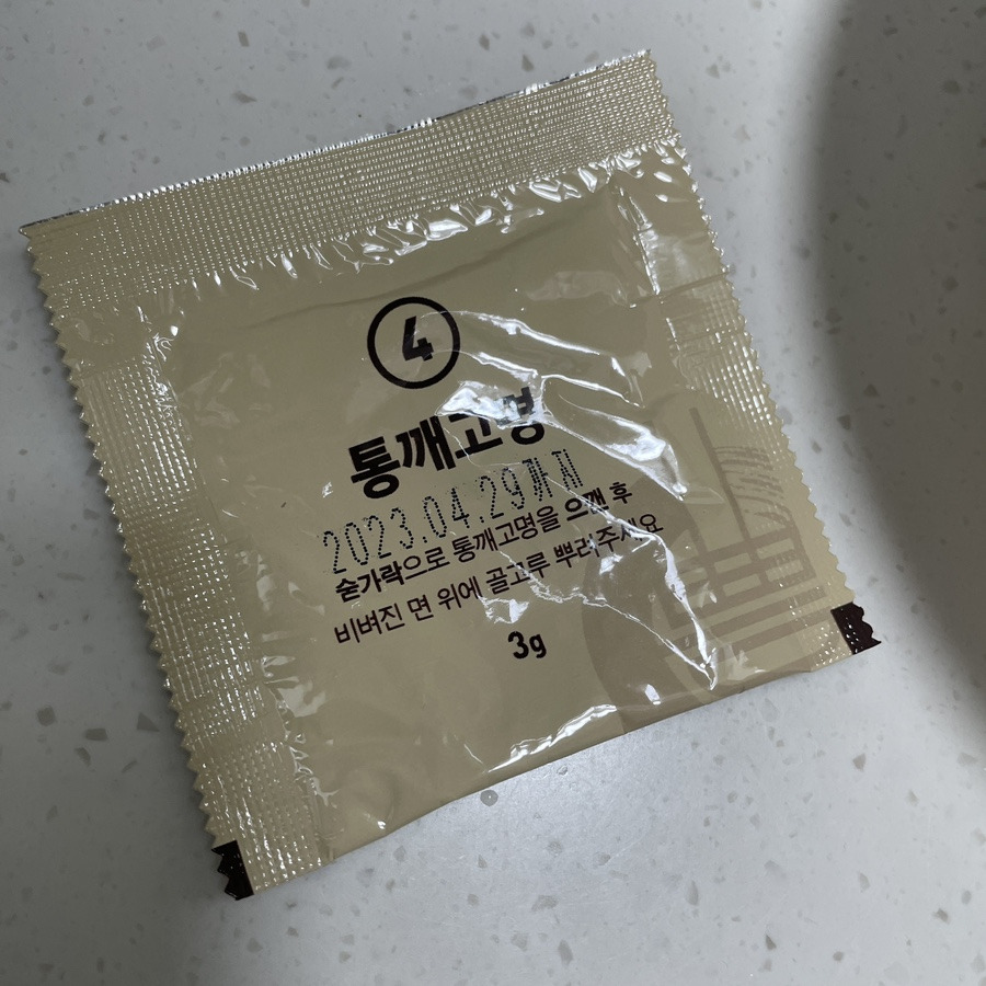 그리고 마지막으로 4번 통깨 고명을 올려주면 됩니다. 통깨 고명은 말 그대로 '통깨'로 구성이 되어있습니다. 따라서 숟가락이나 단단한 물체를 통해 봉지 채로 통깨를 으깨주어야 합니다. (그렇게 진행하라고 설명되어 있어요.) 저도 숟가락을 들고 최선을 다해 봉지 상태의 통깨를 으깨주었는데요, 생각보다 잘 으깨지지는 않았습니다.