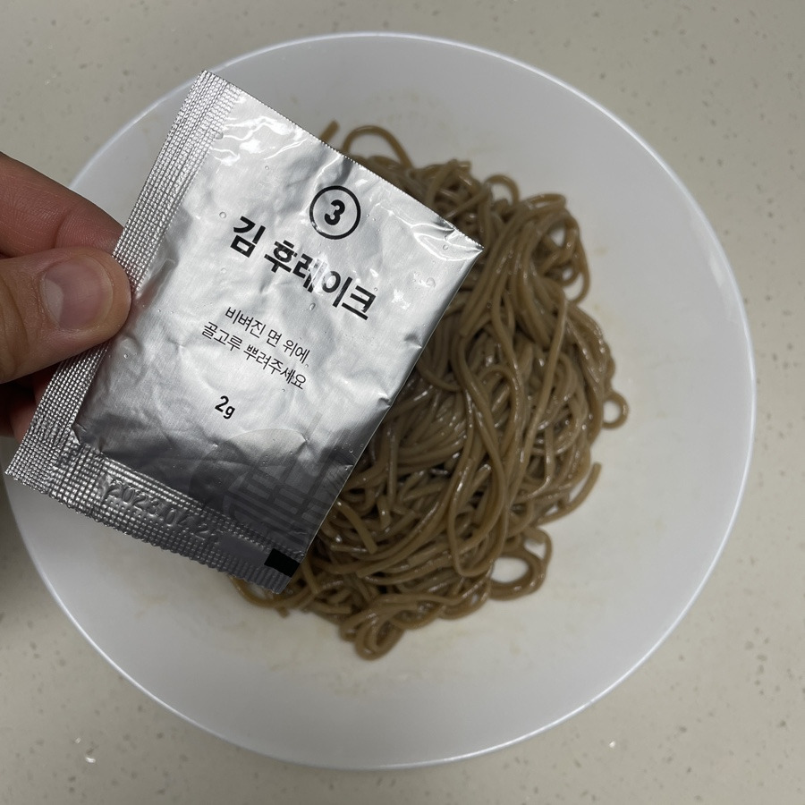 소스가 면에 잘 밸만큼 섞어주었으면, 나머지 고명을 올려줍니다. 먼저 3번인 김 후레이크를 올려줍니다. 김 후레이크는 사각사각 잘린 김이 아닌, 가루로 갈려진 김 가루였습니다. 뿌리는 과정 중에 날릴 수 있으니 조심해서 얌전히 뿌려줍니다.
