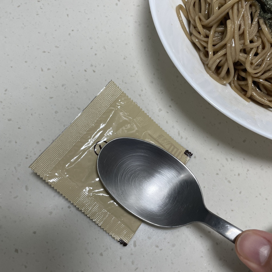 그리고 마지막으로 4번 통깨 고명을 올려주면 됩니다. 통깨 고명은 말 그대로 '통깨'로 구성이 되어있습니다. 따라서 숟가락이나 단단한 물체를 통해 봉지 채로 통깨를 으깨주어야 합니다. (그렇게 진행하라고 설명되어 있어요.) 저도 숟가락을 들고 최선을 다해 봉지 상태의 통깨를 으깨주었는데요, 생각보다 잘 으깨지지는 않았습니다.