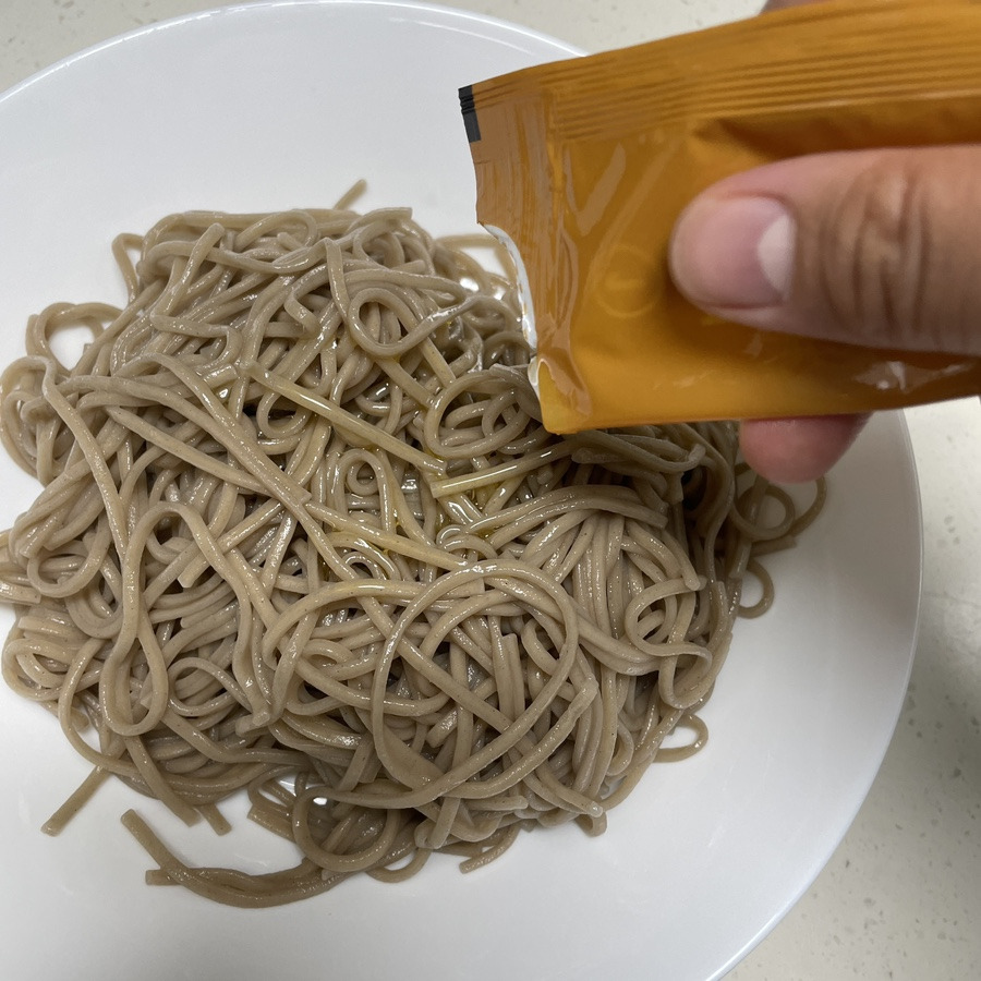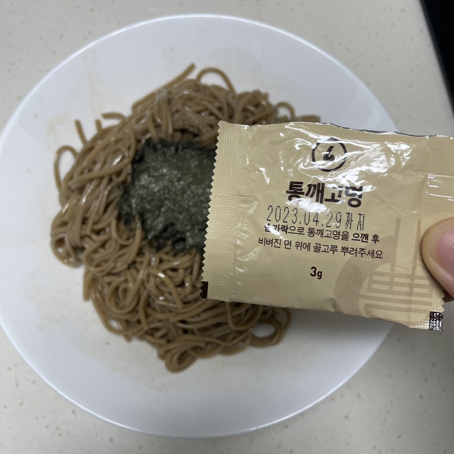 ** 1인분의 메밀면 묶음, 들기름, 간장소스, 통깨 고명, 김 고명 **