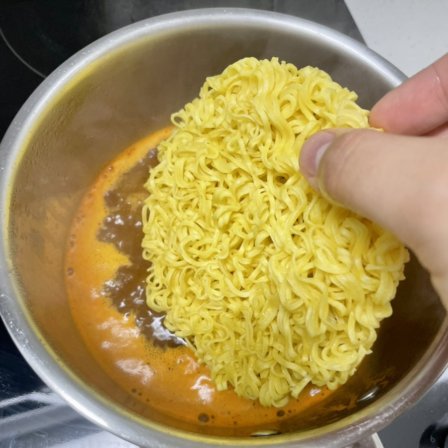 끓인 물에 가루 스프를 넣고, 면을 넣어줍니다.