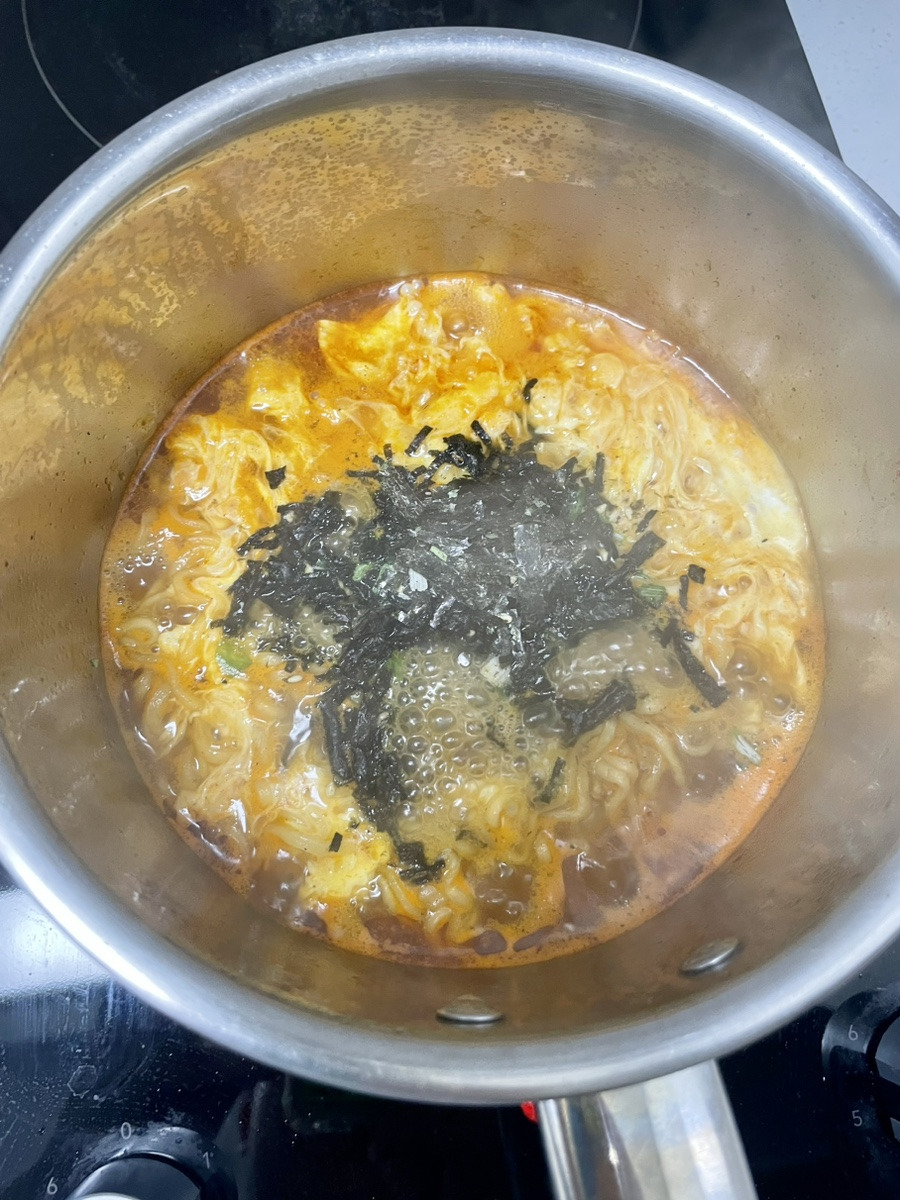 마지막으로 불을 끄고 후첨 토핑을 넣어주었습니다. 김과 깨가 들어있는 토핑이었어요.