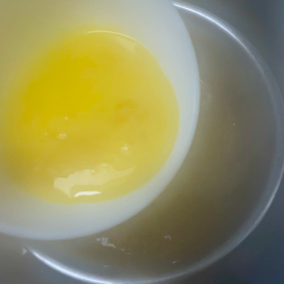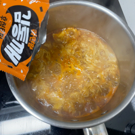 1~2분 정도 지났을 때 풀어둔 계란을 넣었어요. 라면에 계란을 넣어 먹는 걸 좋아해서, 비록 뒷면 설명법에는 나와 있지 않았지만 저는 이것만큼은 저의 뜻대로 해 봣습니다. 푼 계란은 젓지 않고 그대로 끓이면 물이 탁해지지 않아요. 맑은 국물은 먹고 싶지만 계란도 넣고 싶다 하시는 분들은 꼭 계란을 넣은 뒤 인내심을 가지고 기다려 보세요. 😆