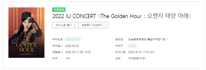 일단 예매를 하는 것부터가 일이었어요. 선예매를 통해서 예매를 했음에도 수많은 유애나 군단에 의해서 원하던 자리는 튕겨지고 마지막으로 시도한 2층 가장 앞 줄에 예매를 할 수 있었습니다. 3년 전 ‘러브 포엠’ 공연에서는 선예매 때 한 두 번만에 원하던 구역에 예매했을 정도로 나름 여유로웠었는데, 3년 동안 팬클럽 가입자가 폭발적으로 늘었다는 이야기는 들었지만 이런 식으로 실감을 할 줄은 몰랐네요.