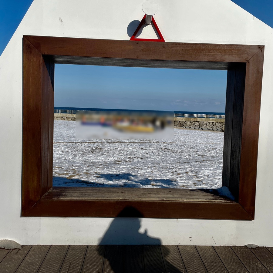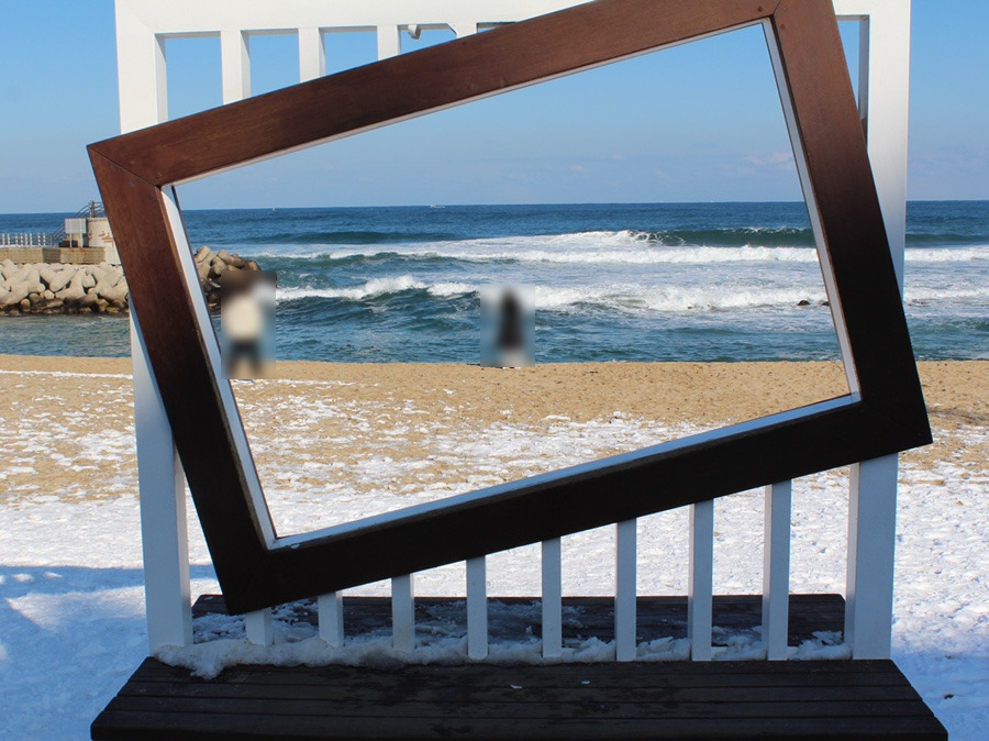 두 번째 강문해변의 포토 스팟은 스타벅스 강문해변점 바로 앞에 있는 '액자' 와 '하트' 구조물이었습니다. 특히 첫 번째 액자의 위치가 바로 뒤에 바다가 보여서 인기가 정말 많더라구요. 사람들이 다들 줄 서서 찍었던 장소였습니다! 여기서 후다닥 사진을 찍고, 조금 걸어가다보니 조금 다른 모양의 액자 구조물이있었는데, 여기는 사람이 별로 없더라구요. 왜 그럴까 생각해보니 뒤에 배경이 그렇게 예쁘지가 않아서 그랬던 것 같습니다. 그래도 저희는 개의치 않고 삼각대를 세워놓고 본격적으로 사진을 찍었죠. 기다리는 사람이 없어서 더욱 부담 없이 사진을 찍을 수 있었습니다. ᕦ( •ᗜ•)ᕤ