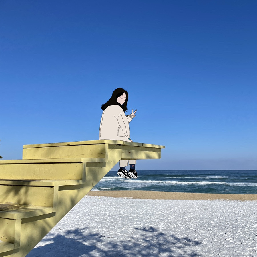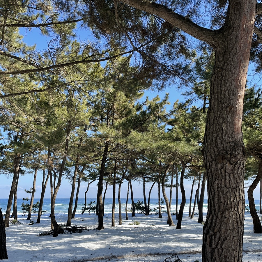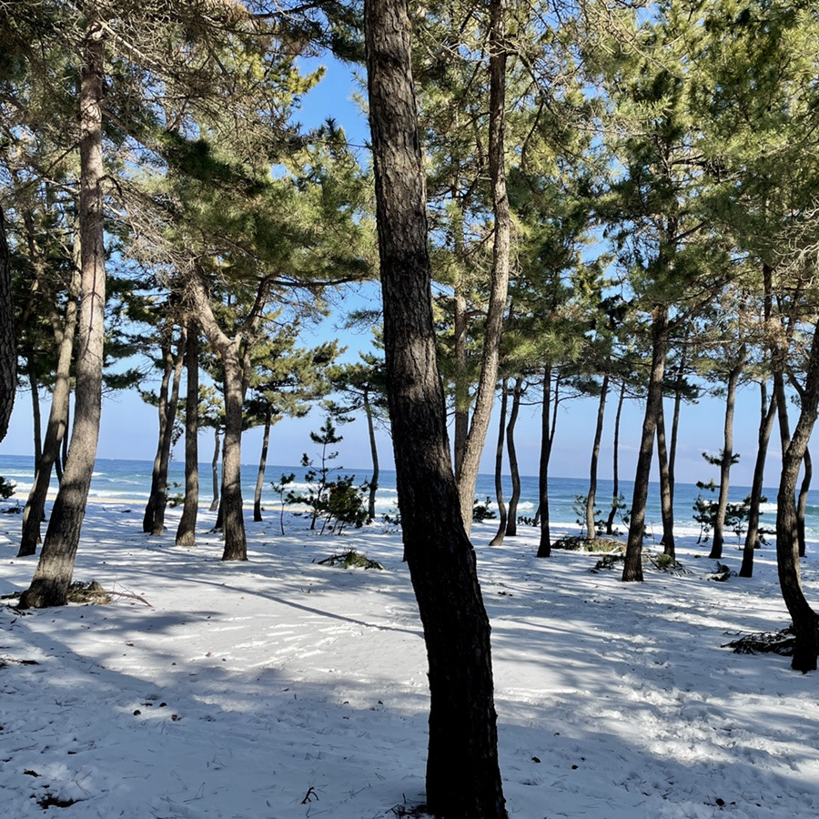 아침을 먹고 강문해변에서 시간을 보내기로 했습니다. 강문해변에 포토 스팟이 굉장히 많다는 소식을 익히 들어서 알고 있었거든요. 그래서 강릉의 여러 해변 중에서 역과도 가까우면서 즐길 거리도 많은 강문해변으로 정했습니다. 강문해변까지는 버스를 타고 가기로 했어요. 버스를 타고 가면서 보니까 강릉에는 소나무가 참 많았어요. 바다와 눈과 소나무와 파란 하늘이 어울어져서 굉장히 예뻤습니다. ⌯'▾'⌯ 첫 번째 사진은 버스 타고 지나가면서 찍은 사진입니다. 생각보다 잘 나와서 만족스러워 하고 있죠!