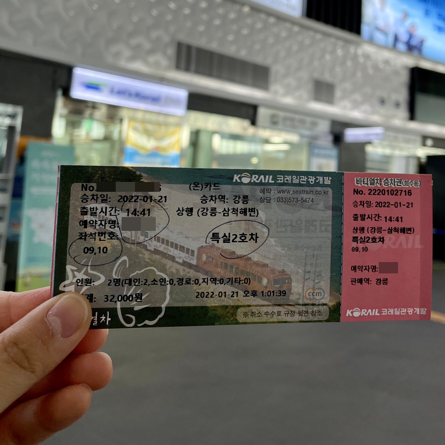 오후 2시까지 알차게 강문해변에서 놀다가, 숙소가 있는 삼척으로 이동을 시작했습니다. 강릉에서 삼척해변역까지 '바다열차'를 타고 가기로 했어요. 온라인에서 자리를 미리 예매하고, 강릉역의 창구에 가서 실물 표를 받았습니다. 이제와서 생각해보니까 표 검사를 따로 하지는 않았던 것 같은데, 실물 표는 기념품이었을까 싶기도 하고, 온라인 예매 내역만 있으면 되는 거였을까 싶기도 하고, 뭐 그런 생각이 드네요.