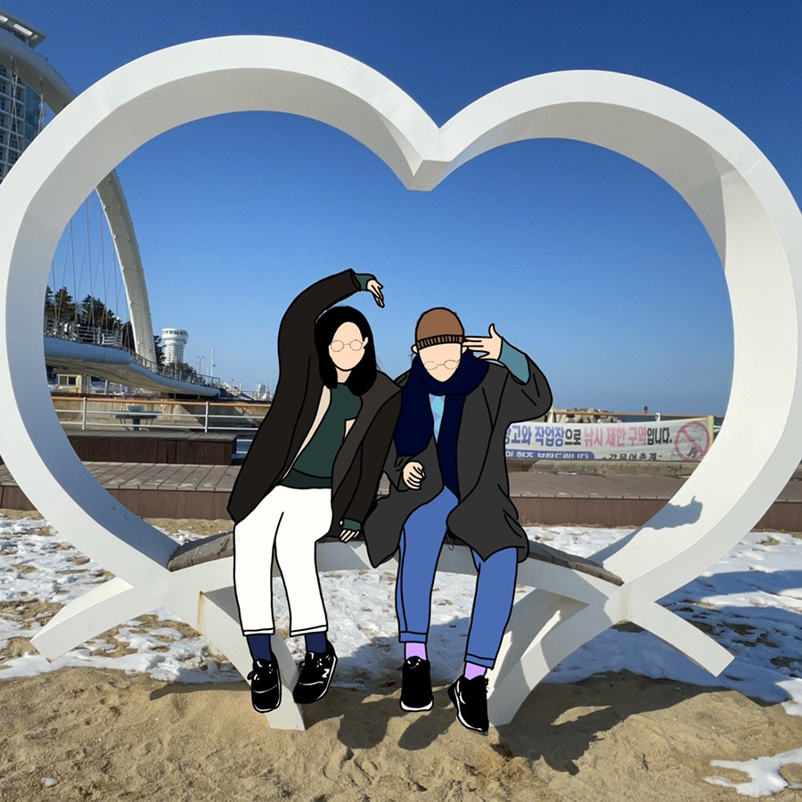 마지막 사진은 하트 구조물에서 완성되지 않은 하트를 그린 저희의 모습을 담아보았습니다. 핸드폰용 카메라 블루투스 리모콘을 챙기기는 했었는데, 배터리를 준비하지 못해서 어쩔 수 없이 타이머를 맞춰놓고 후다닥 가서 사진을 찍는 방식으로 찍었어야 했거든요. 의도한 건 아니지만 하트는 완성되지 못 했고, 사진은 나름 잘 나왔습니다. ٩(๑ˆOˆ๑)۶