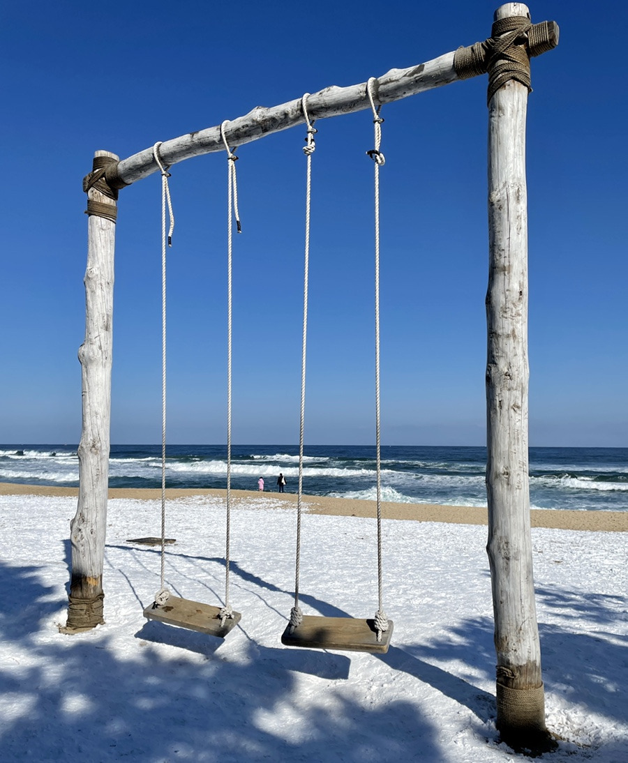 파란 하늘과 더 파란 바다, 그리고 모래와 하얀 눈이 한 화면에 전부 담기는 구도여서 제일 예뻤던 것 같아요. ⊂(´・◡・⊂ )∘˚˳° 나무 그네에서 찍는 것도 예쁘게 나왔습니다. 둘이 바로 옆에 붙어 있어서 차례차례 찍을 수 있었습니다. 해당 장소는 '세인트 존스 호텔'로 검색하고 이동하면 그 호텔 앞에 있는 해변에서 볼 수 있습니다.