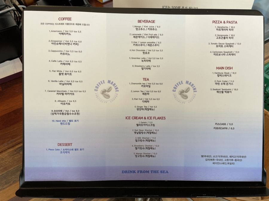 마린데크에서 판매하는 메뉴는 아래와 같습니다. 커피와 핸드드립, 그리고 여러 디저트와 식사를 판매하고 있었어요. 저희는 이미 밥을 먹고 왔기 때문에 커피와 사과파이를 주문했어요.