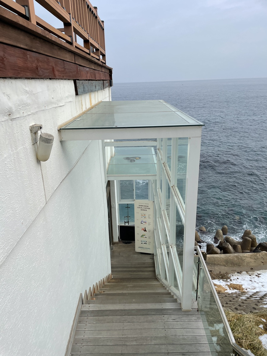 바다와 가까이 붙어있는 이 공간은 바다로 내려가는 듯한 계단을 내려가야만 만날 수 있는 카페였습니다.