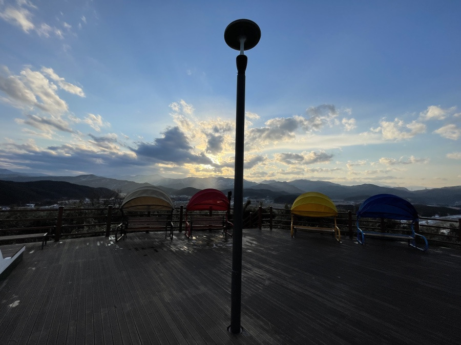 정상까지는 총 길고 가파른 계단을 2번 오르면 되었습니다. 그리고 그 중간에 쉼터가 아주 적정한 공간이 존재해주었죠. 마침 딱 힘이 들 때 살짝 쉬어주고, 한 번 더 계단을 오르면 ★정상☆에 도착할 수 있습니다. 저희가 갔을 때가 마침 해가 지고 있던 일몰 시간이었어요. 그래서 하늘이 아련한 빛을 보이고 있었고, 그 아름다운 모습을 한 눈에 볼 수 있었습니다.정상에 올랐기 때문에 이런 경치를 눈과 카메라에 담을 수 있었죠. 저는 저의 선택을 후회하지 않았습니다. ٩(*˙︶˙*)۶