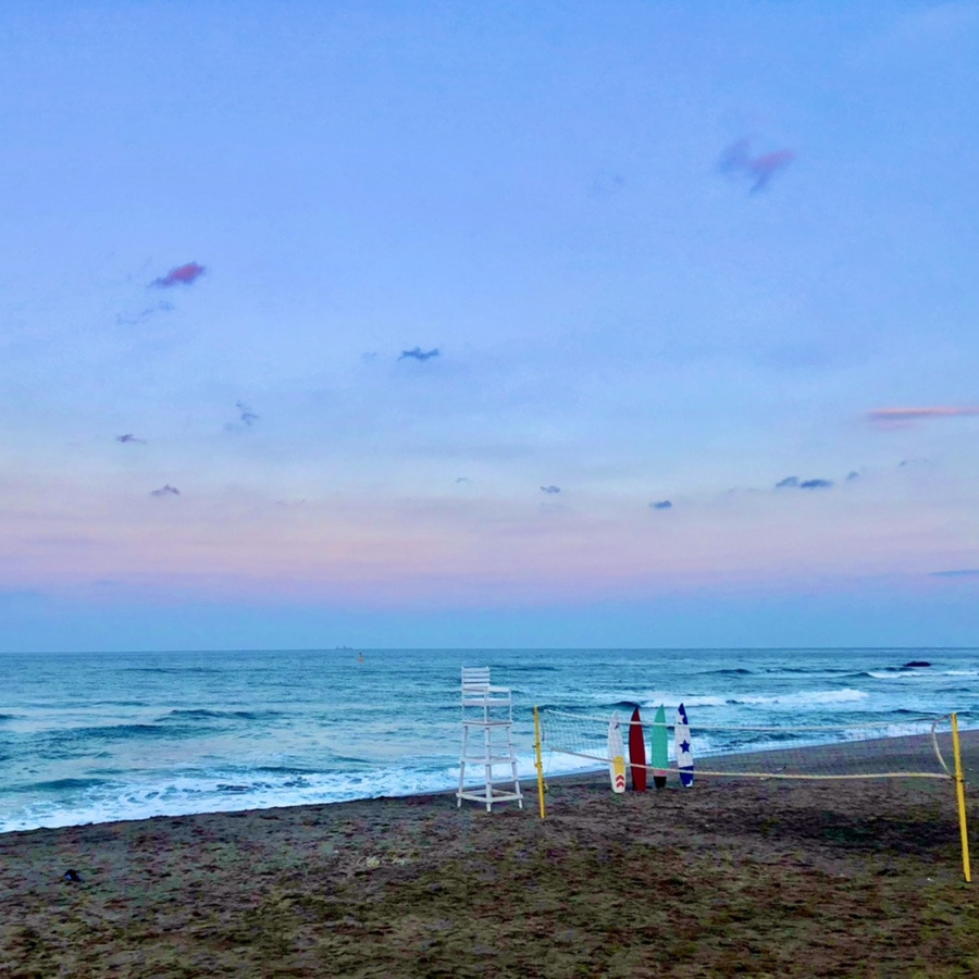 일몰 때의 바다도 참 예뻤습니다. 하늘이 파랑과 분홍으로 알록달록 물들고, 그 색을 따라서 물이 든 구름을 찾아 보는 게 재미있었습니다. 바다와 하늘 그 자체로도 예뻤고, 알록달록한 색으로 세워진 서핑 보드도 예뻤고, 수영장 혹은 해수욕장에서 라이프 가드들이 앉아있을 법한 길다란 의자도 예뻤고, BTS의 버터 앨범 자켓 사진으로 사용된 파라솔과 의자도 예뻤습니다. 파라솔 펼쳐져 있었으면 더 예뻤을 텐데, 그건 복불복이라고 하더라구요. 그래도 그 자체로도 색이 쨍 해서 예뻤습니다. ҉*( ‘ω’ )/*҉