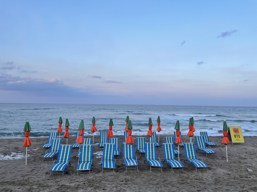 일몰 때의 바다도 참 예뻤습니다. 하늘이 파랑과 분홍으로 알록달록 물들고,  그 색을 따라서 물이 든 구름을 찾아 보는 게 재미있었습니다. 바다와 하늘 그 자체로도 예뻤고, 알록달록한 색으로 세워진 서핑 보드도 예뻤고, 수영장 혹은 해수욕장에서 라이프 가드들이 앉아있을 법한 길다란 의자도 예뻤고, BTS의 버터 앨범 자켓 사진으로 사용된 파라솔과 의자도 예뻤습니다. 파라솔 펼쳐져 있었으면 더 예뻤을 텐데, 그건 복불복이라고 하더라구요. 그래도 그 자체로도 색이 쨍 해서 예뻤습니다. ҉*( ‘ω’ )/*҉