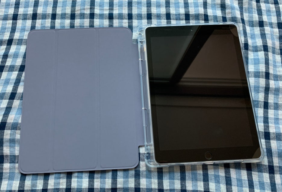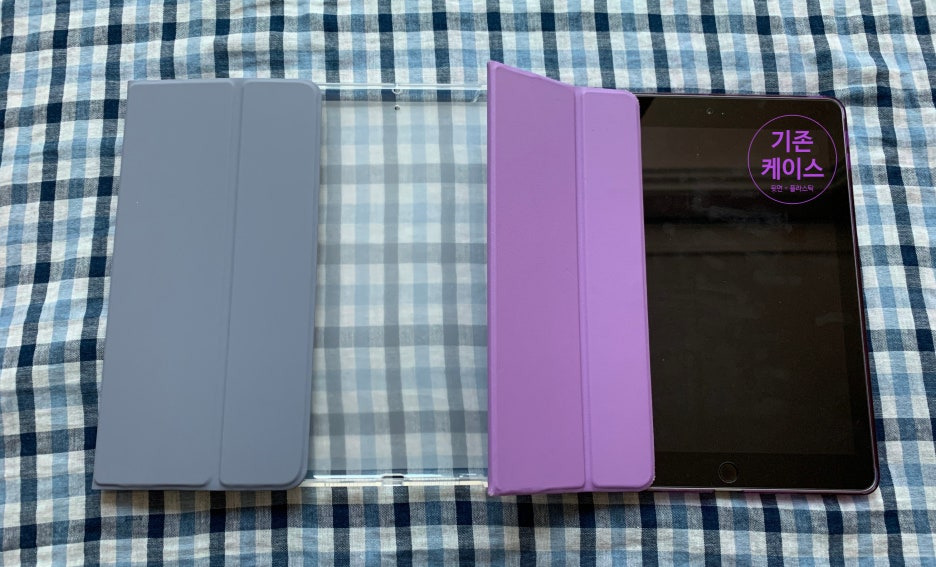기존 케이스는 아래에 있는 보라색 덮개의 케이스였는데요, 아이패드의 뒷면을 감싸주는 부분이 딱딱한 플라스틱 재질로 되어 있어서 깨지기도 쉬웠고, 탈착 과정에서 케이스에 미세한 흠집을 낼 것 같았습니다. 그래서 이번에는 뒷면이 부드러운 TPU* 재질로 되어 있는 것으로 선택했어요. 확실히 케이스에 부담도 덜 가고, 만지기에도 부드럽고 기존 것보다 훨씬 좋았습니다.