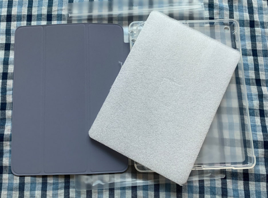 기존 케이스는 아래에 있는 보라색 덮개의 케이스였는데요, 아이패드의 뒷면을 감싸주는 부분이 딱딱한 플라스틱 재질로 되어 있어서 깨지기도 쉬웠고, 탈착 과정에서 케이스에 미세한 흠집을 낼 것 같았습니다. 그래서 이번에는 뒷면이 부드러운 TPU* 재질로 되어 있는 것으로 선택했어요. 확실히 케이스에 부담도 덜 가고, 만지기에도 부드럽고 기존 것보다 훨씬 좋았습니다.