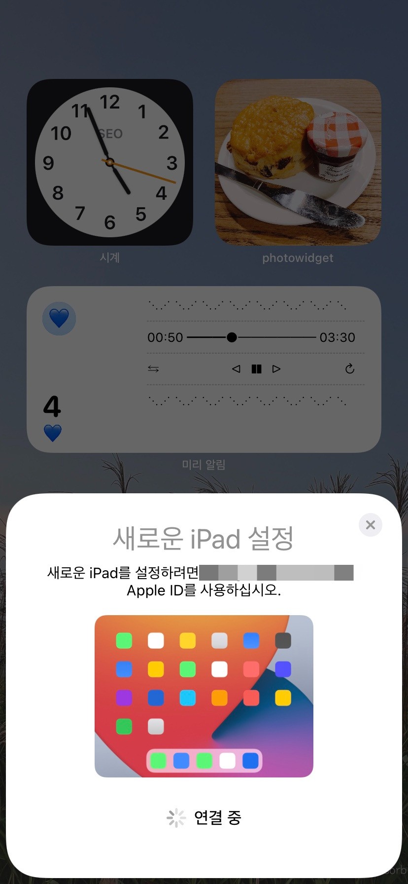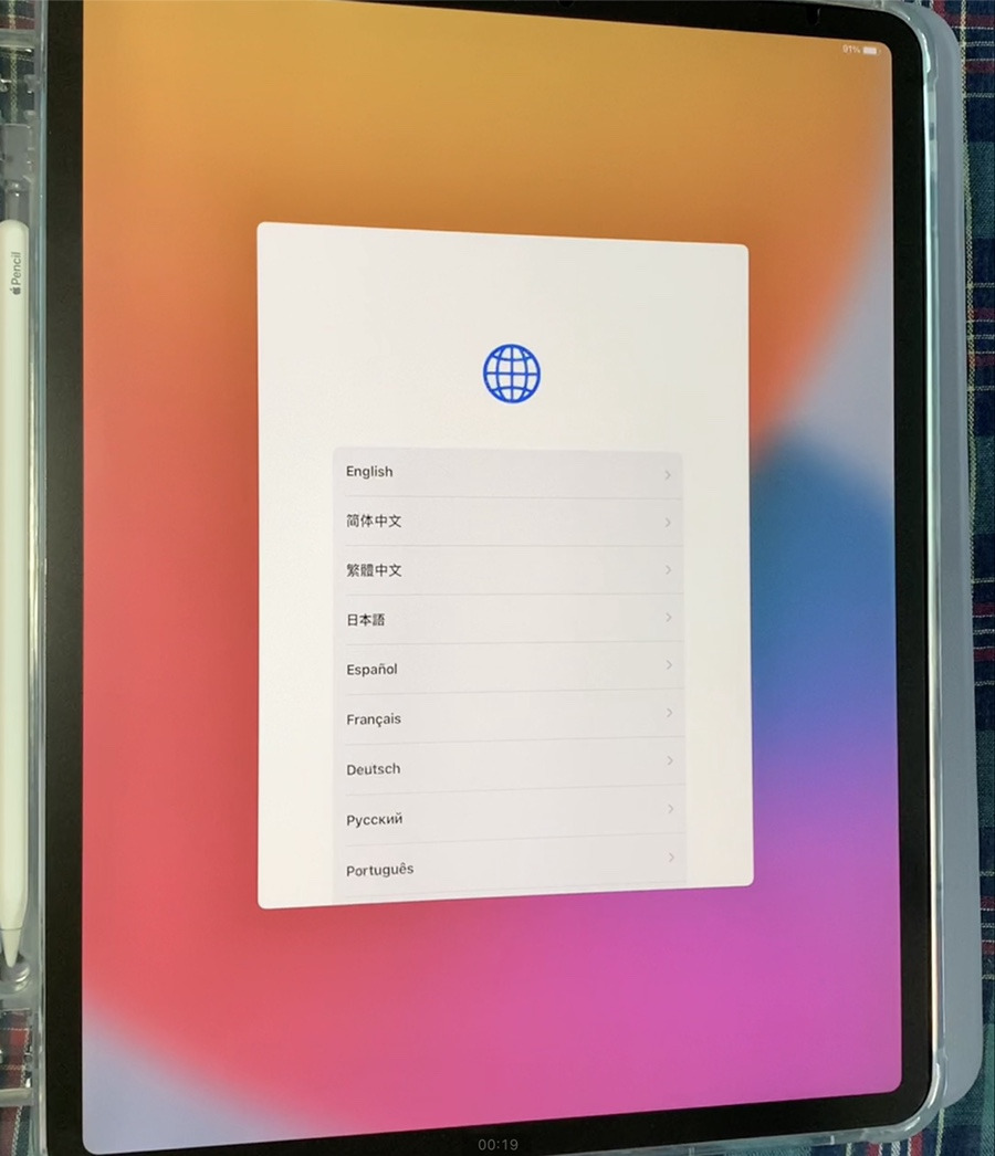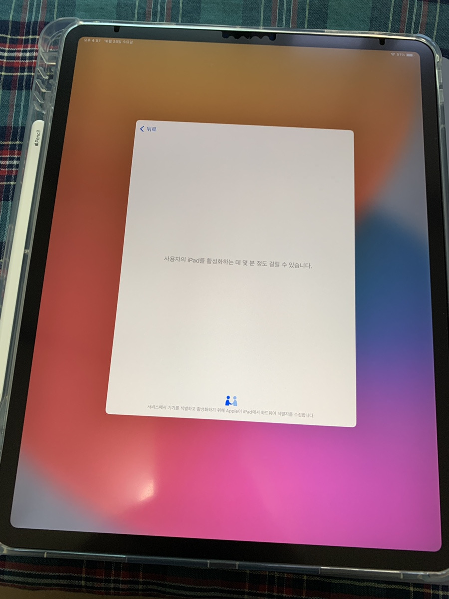 초기 설정은 더할나위 없이 쉽습니다. 아 물론 기존에 애플 제품(아이폰)이 있다는 전제 하이기는 하지만요. 저는 종이질감 필름을 붙이고, 케이스도 끼운 다음 설정을 진행했는데요. 먼저 전원을 켜고 > 한국어 선택 > 대한민국 선택 > 빠른 시작 순서로 진행합니다. 빠른 시작은 옆에 아이폰이 있으면 아이폰으로 이상한 그림 스캔하라고 한 뒤 곧장 설정이 완료가 되는 방식입니다. 그래서 손쉽게 할 수가 있어요.