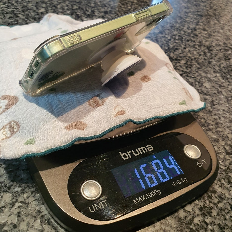 [투명 범퍼 케이스 + 그립톡]을 장착한 상태에서도 168.4g 으로 아이폰XR의 생폰 무게보다 약 25g 정도 가벼웠습니다.