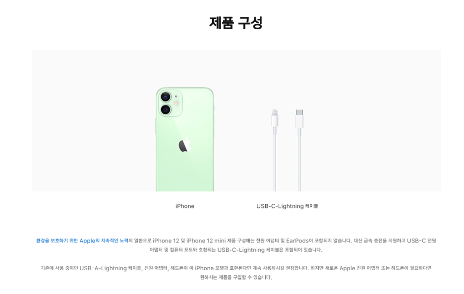 간단하게 언박싱을 해봤어요:) '환경을 보호한다는' 애플의 정책과 함께 줄어든 구성품은 박스 크기에도 반영이 되었죠. 핸드폰 본체와 케이블 이렇게 구성이 되어있습니다. 공식 홈페이지에 나와있는 그대로 말이죠.