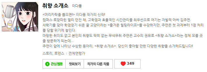 월요일을 앞둔 일요일 저녁, 이대로 소중한 일요일의 한가로움을 보내버리기에는 아쉬운 마음에 네이버 웹툰 속 완결 작품을 뒤적거리던 저의 눈에 걸린 작품, 이다몽 작가님의 『취향 소개소』입니다. 그리고 47화에 달하는 이야기를 숨 쉴 틈도 없이 단숨에 읽어버렸습니다. 저물어가는 어느 주말을 밝게 비춰주었던 이야기를 읽으며 어떤 생각을 했었는지, 한번 풀어보도록 하겠습니다.