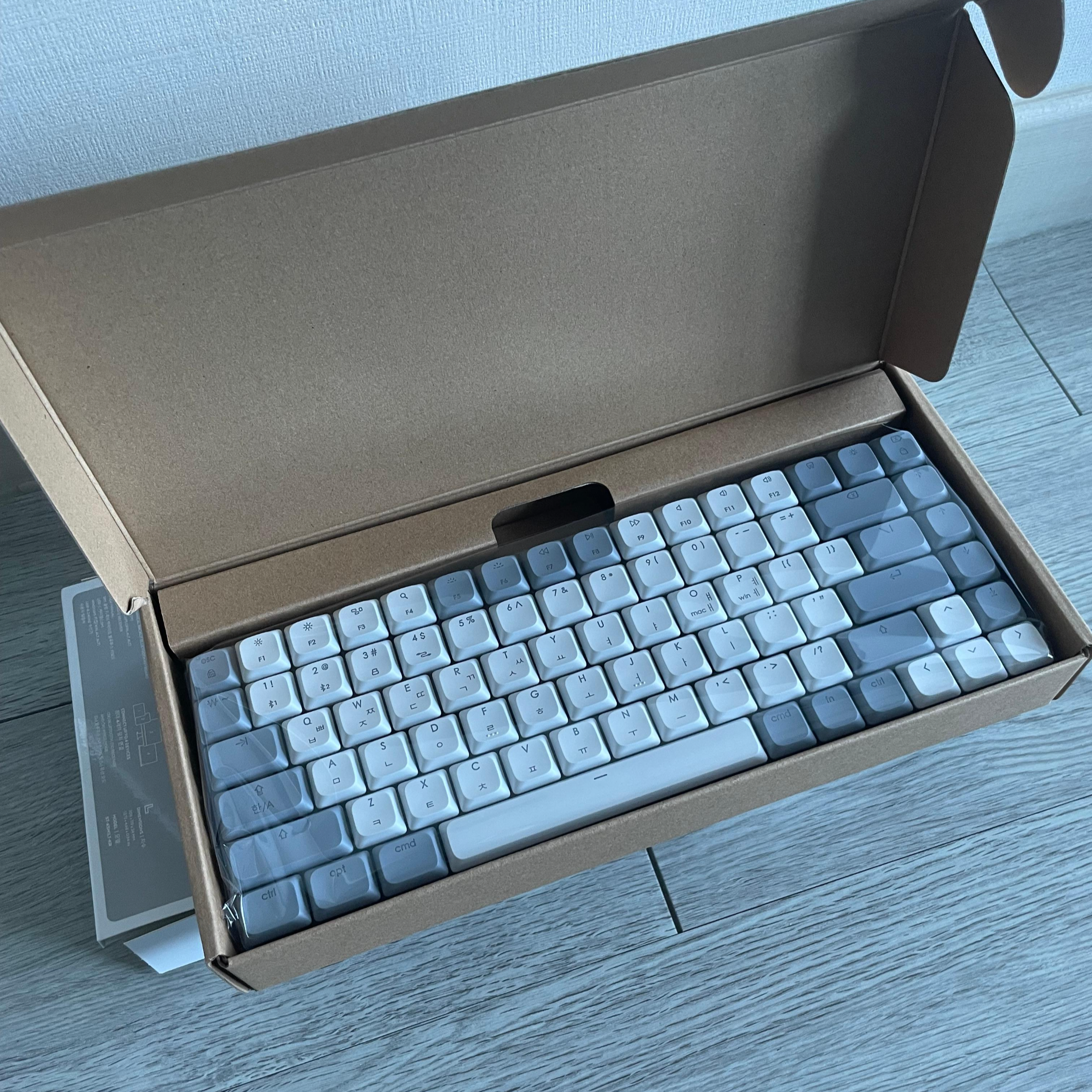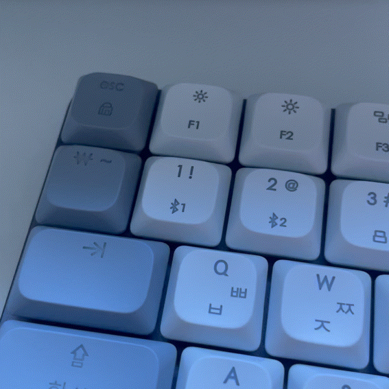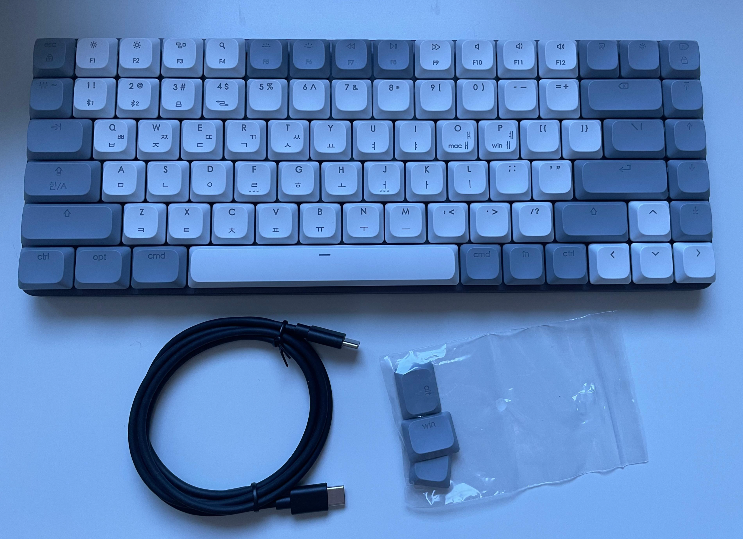 창문에 비친 자연광에서 찍은 사진이라 색감이 조금 차이가 있는데, 실제 색상은 아래보다는 위의 사진이 실제 색상에 더 가깝습니다. 아무튼 키보드를 책상으로 가져와서 찍어봤어요:) 여분 키캡의 경우 윈도우 OS 사용할 때 바꿔서 사용하라고 준 키캡이더라고요. 저는 맥북이라 바꿀 필요가 없었습니다.