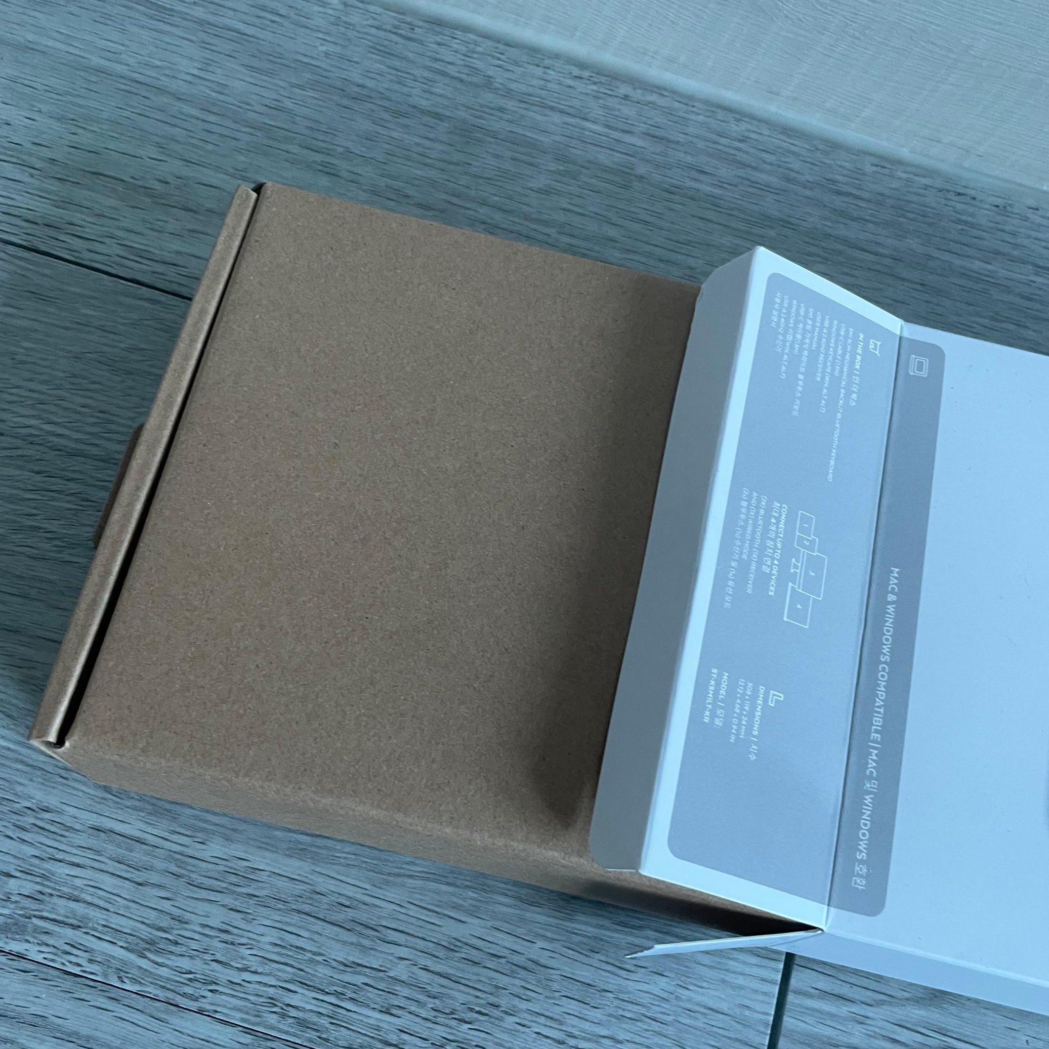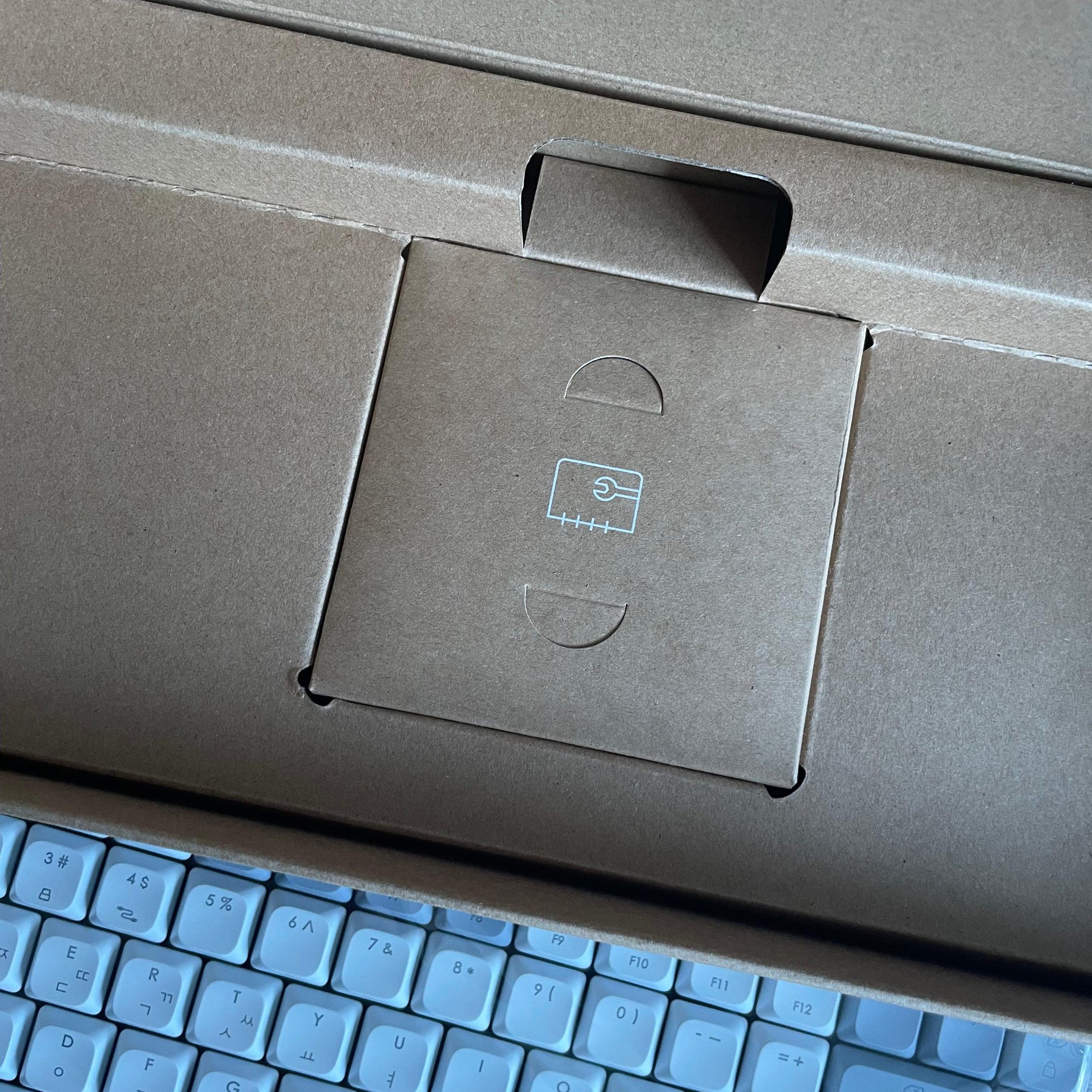 키보드 박스는 단순했습니다. 키보드를 설명해주는 겉박스와 키보드를 담고 있는 속박스로 구성이 되었어요. 군더더기 없는 깔끔함이 오히려 좋았습니다. 특히 무겁지 않고 쓰레기도 많이 나오지 않는다는 점에서 만족스러웠어요. 구성은 단순했지만, 박스가 두껍고 튼튼해서 물건을 온전히 감싸고 있어서 안전하겠다고 생각이 들었습니다.