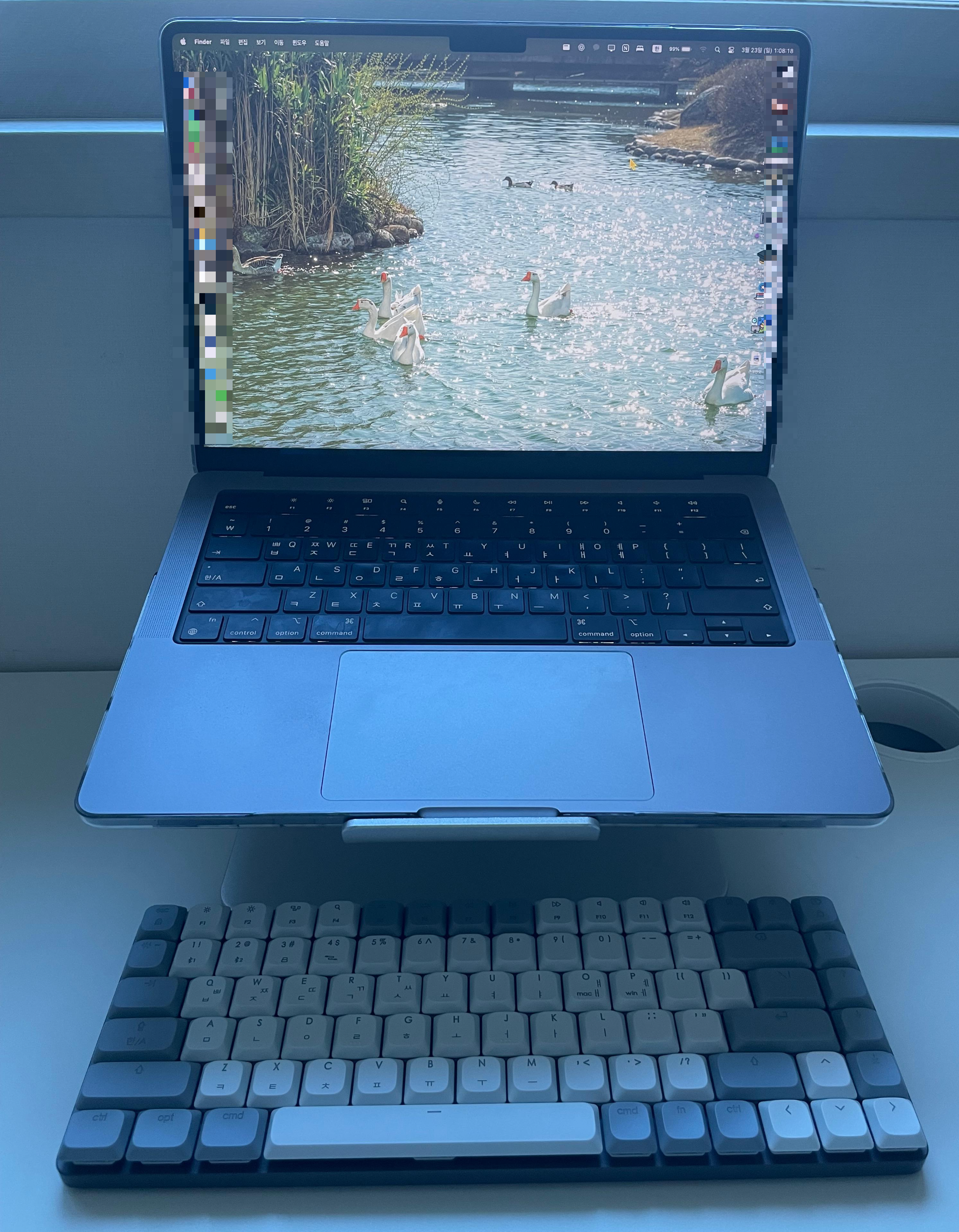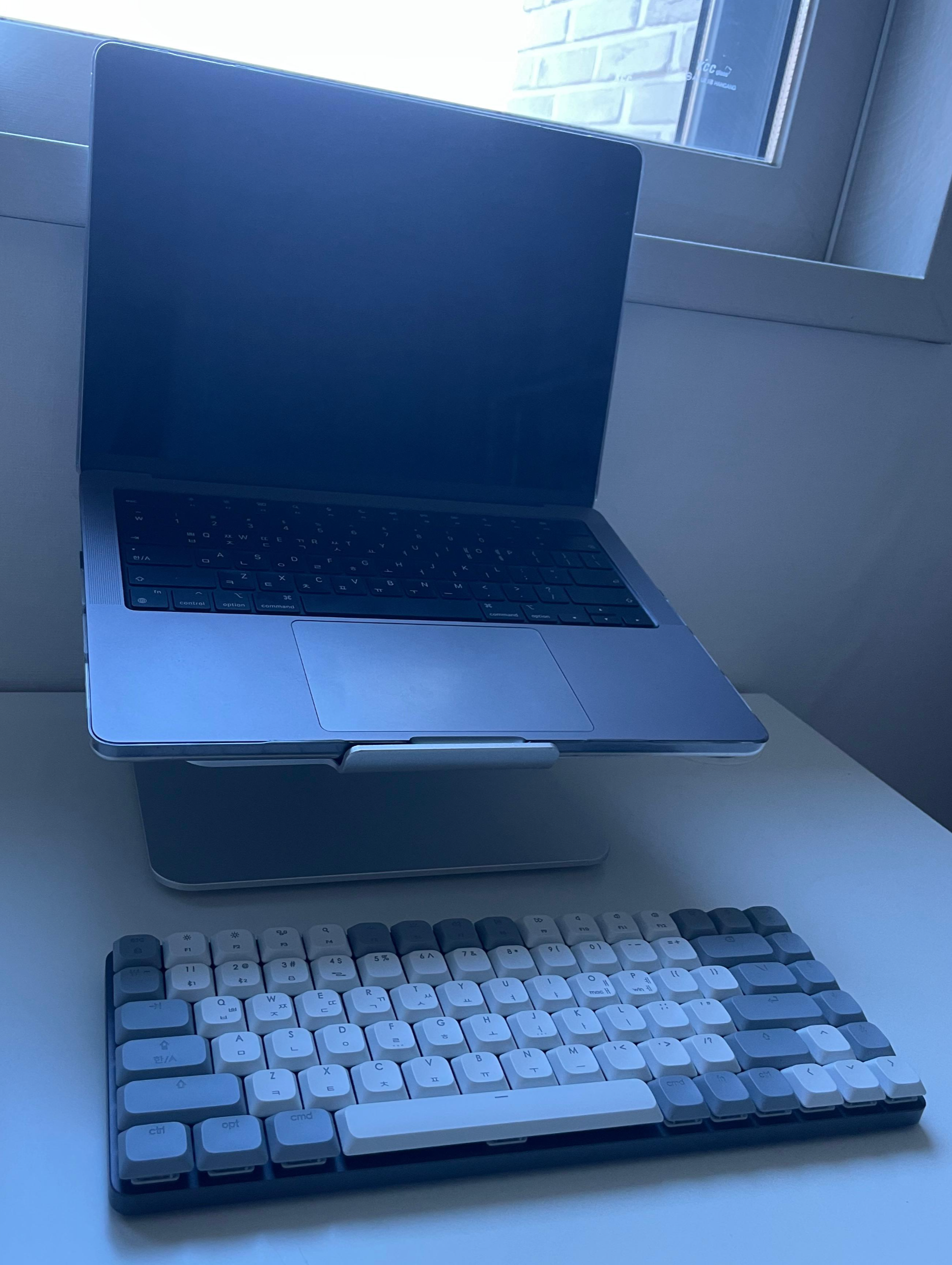 마지막으로 노트북과 함께 배치한 키보드를 보여드리겠습니다. 맥북과 정말 잘 어울려요.👍 깔끔한 거 좋아하는데, 꽤나 만족스러운 선택이었습니다. 알고 보니 해당 브랜드의 키보드가 애플 스토어에서도 판매가 되는 제품이라고 하더라고요. 분명 매장가서 사면 제가 산 것 보다는 비쌌을 게 뻔한데, (알아보지는 않았지만, 그러겠죠..?) 그것보다는 싸게 샀을 거라고 생각을 해 보니, 더욱 만족스럽습니다.