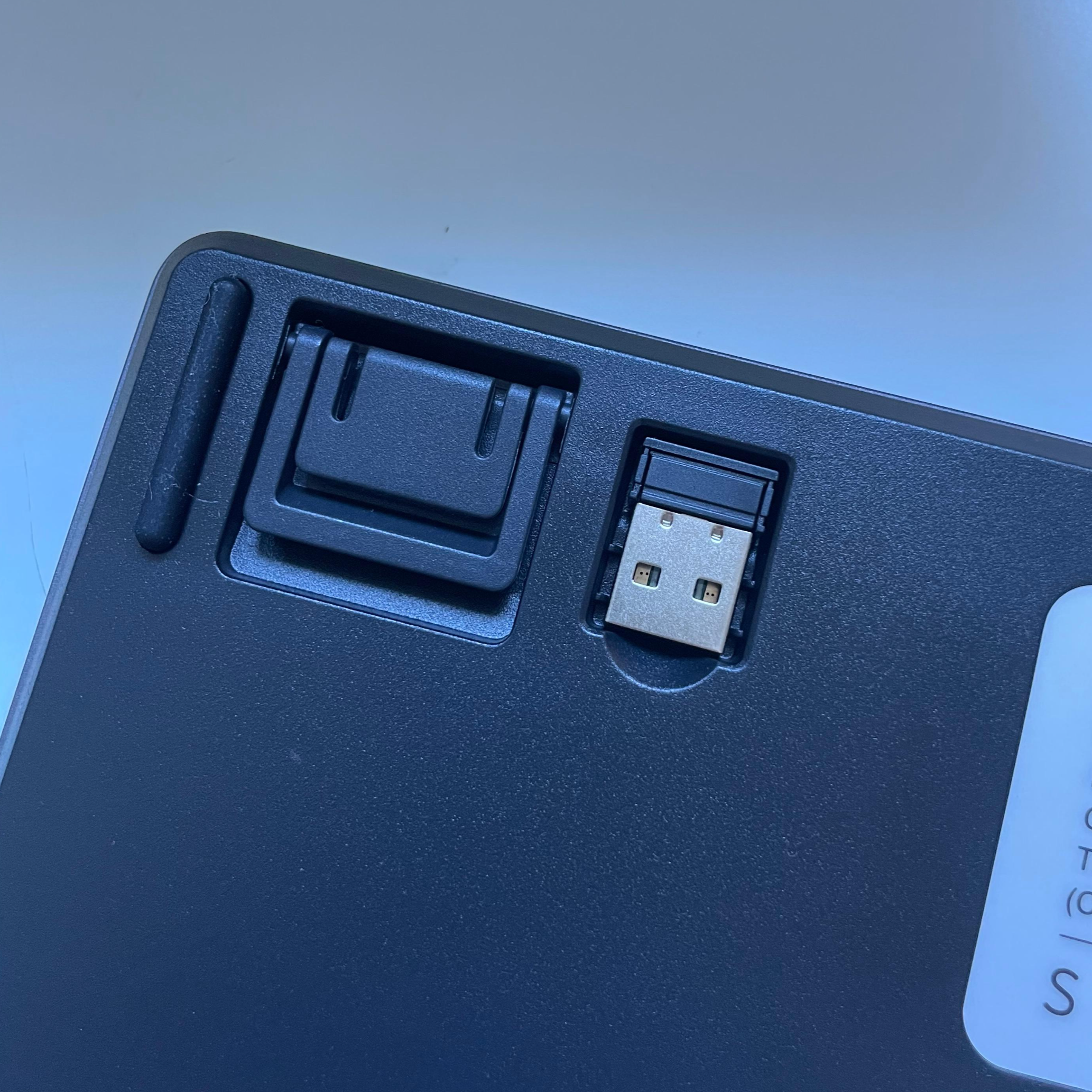 그리고 키보드를 뒤집어 보면, 다음과 같이 USB 리시버가 있습니다. 컴퓨터 및 디바이스에 바로 꽂아서 사용할 수 있는 리시버죠. 제 노트북에는 USB를 꽂을 수 있는 공간이 없어서 크게 사용할 일이 없겠지만, 데스크탑을 사용할 때에는 분명 유용할 것 같습니다. 해당 리시버가 자석으로 붙어 있어서 잃어버릴 일은 크게 없을 것 같아요. 그리고 키보드 양쪽으로 높이 조절을 할 수 있는 다리가 있는데, 사용자의 편의성에 맞춰서 조절해서 사용할 수 있는 부분인 것 같습니다. 참고로 저는 낮은 게 좋아서 그냥 쓰고 있어요.
